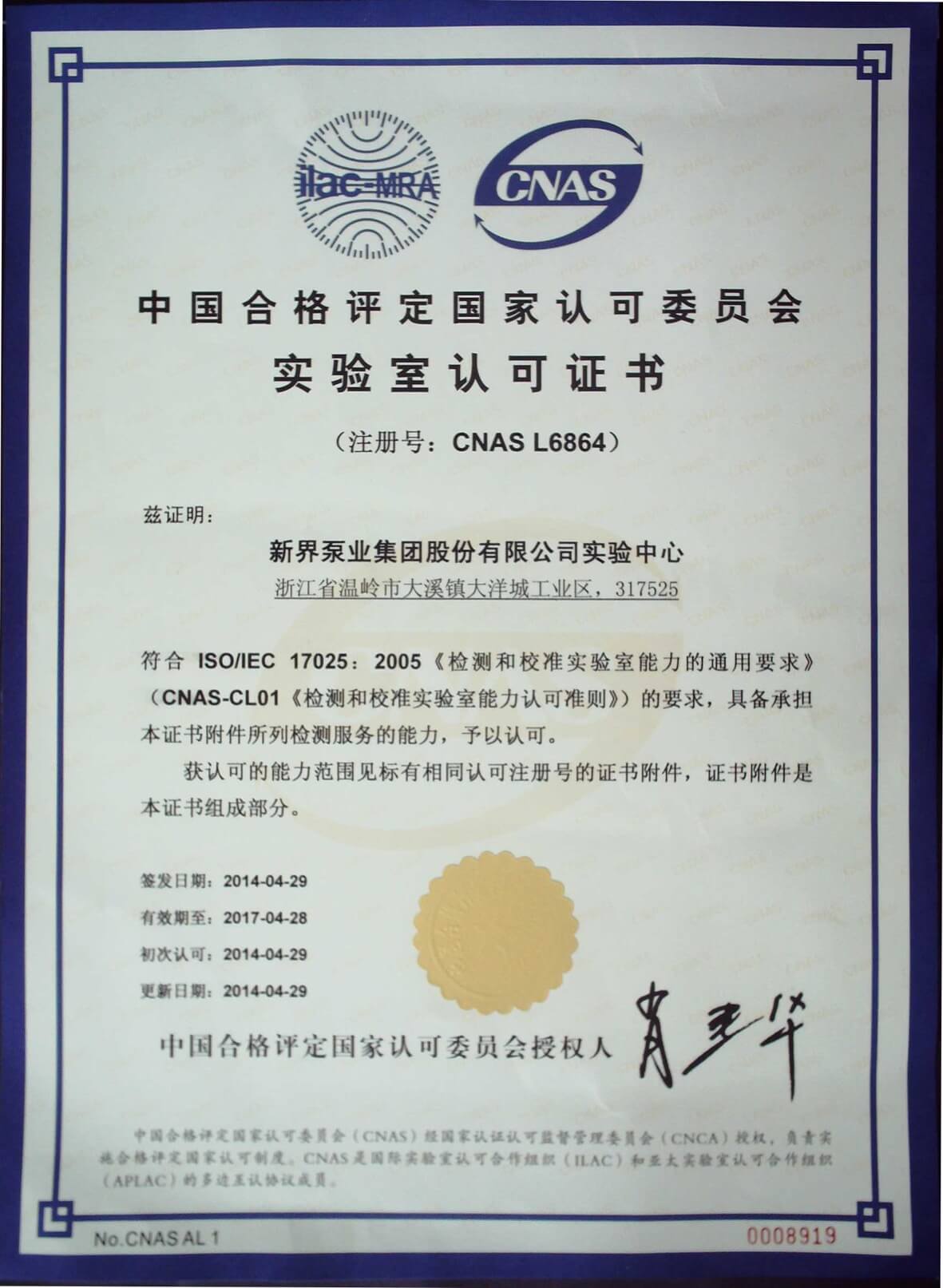 ? ? 新界泵業集團股份有限公司實驗中心于2014年1月順利通過中國合格評定國家認可委員會(CNAS)委派的專...